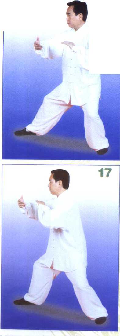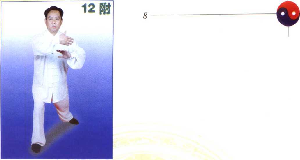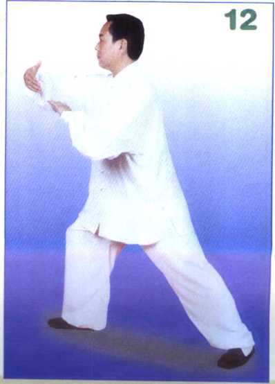 右腿弓,左腿蹬成右弓步势。 同时右小臂由下向前上撷,掌心朝 内,高与胸平,左掌随右臂略向下 向前推送,掌心朝前下,两手腕部 前后距离约一肘为度。眼神先顾及 两手左侧抱球,再随右才朋前视。 (图12、附图12正面图)