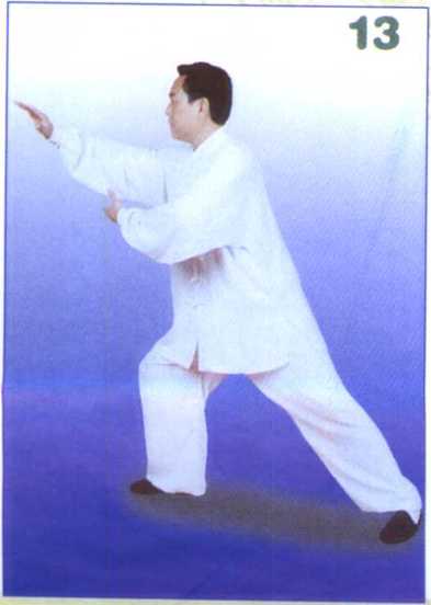 两臂稍前展,同时右臂内旋使 掌心朝左下,左臂外旋使掌心朝右 上,腰胯微松沉。(图13)