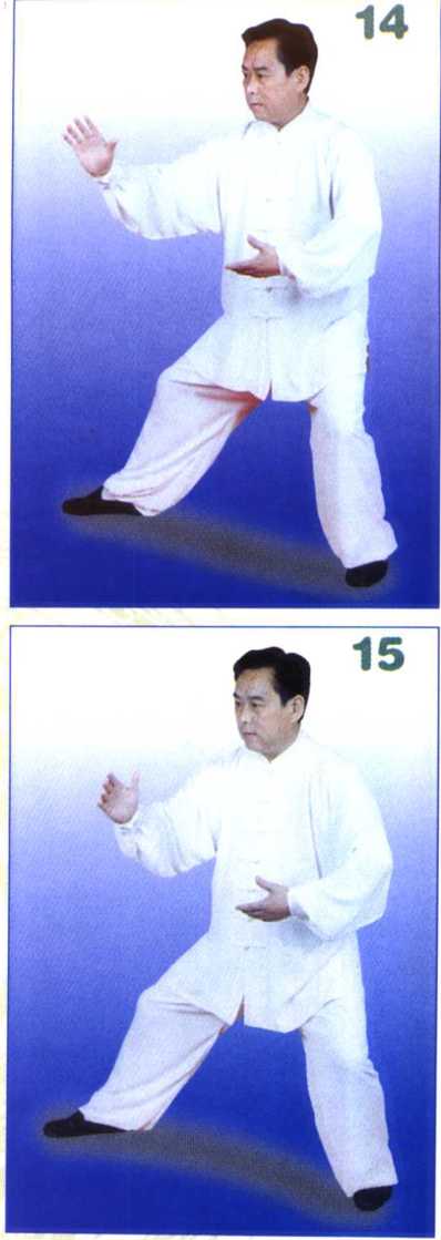 重心坐实左腿,成右虚步,同 时身体微左转。(图14)