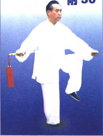 ②前动不停,重心前移,左腿提 起,身体亦略高起。同时两手抱剑弧 形向前微送。眼前视。(图34)