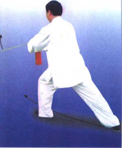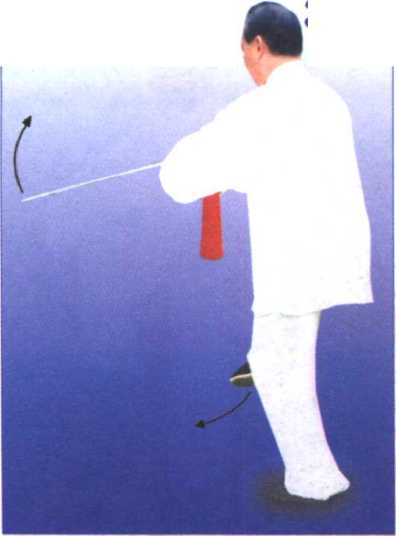 ①做“转体分剑”动作时,注意向左转动的力量,要从提左 腿开始。左腿提起时,腰胯间就要开始向左拉动,带动左腿后 摆,右腿产生向左旋转的内力,随之右脚跟向外碾摆(不是抬脚 跟),加上右脚跟落实时松沉腰胯, 转身动作就会顺和自然,轻灵稳定。