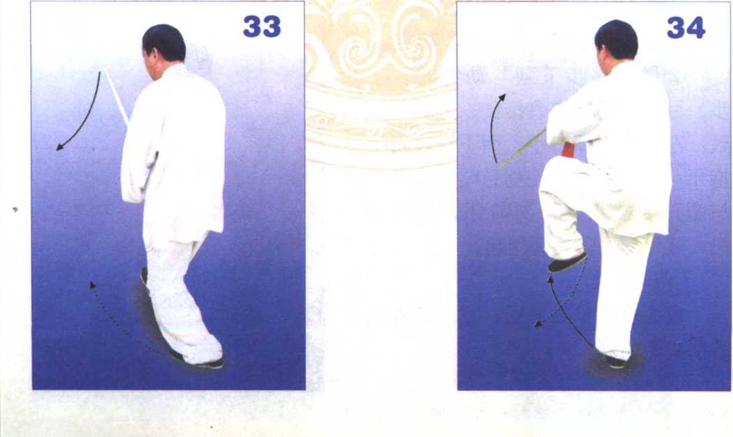 ①左腿重心不变,脚尖外撇45度 踏实,随之提起右腿,左腿半立起; 两手抱剑不变,随右腿提起,将剑稍 向前、向上、向胸前弧形平捧起,剑 尖朝前,力达剑脊上前端,面朝西北 (图32)。接着右脚向前下落,先脚跟 着地,同时两手抱剑使剑柄向前下沉 与腹齐,力达剑脊下前端,剑尖上翘 与胸齐,身体亦略下沉。眼随剑摆而 前视。(图33)