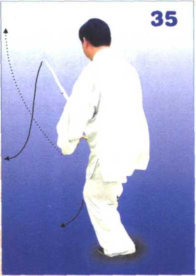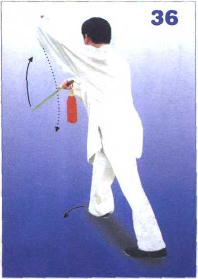 前势略顿,随左脚下落,右脚上 前一步,随即弓腿成右弓步式。同时 右手仰手持剑向前下刺,剑尖低于 膝,力贯剑尖。左手随弓步臂内旋向 后、向上、向前划弧置于额角左前上方,臂呈弧形,手心朝外, 剑指朝前(也可直接抬手上举)。眼随剑前视。(图36)