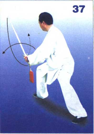 右腿弓步不变,右手仍仰手握 剑,迅速沉胯、沉肘、沉腕、剑身上 扬,力贯剑尖,使剑尖高与头齐;同 时左手下落,剑指抚于右腕处,两臂 呈弧形。眼随剑尖上崩前视。(图 37)