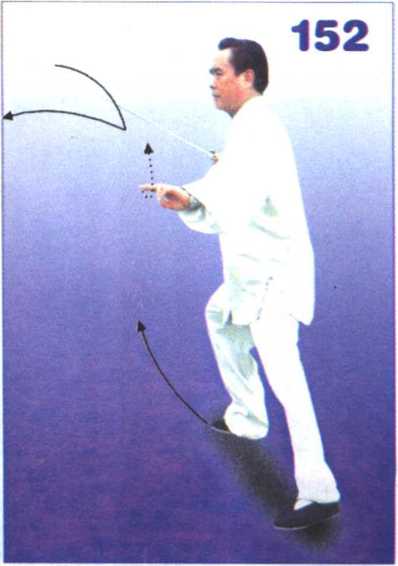 ①重心稍左移,但仍偏于右腿, 同时左腿稍屈,脚跟内收45度成丁八 步,腰身左转朝西;右臂稍外旋,剑 尖稍外摆,肩肘略沉屈,同时左手剑 指变掌向左平展于左膝上,手心朝 下,五指朝前,身形圆展,眼向前 (西)视。(0152)
