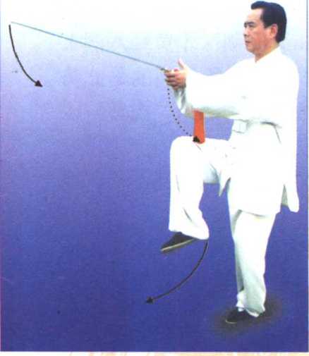 在做上述动作时,重心左移要 松胯沉裆平移;左腿要随提右腿斩 剑立起,但不能太直。