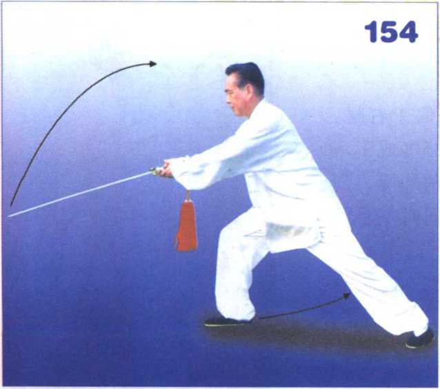 “动作2跳步摆剑”和“动作3弓步下刺”,其动作做法与 第七式“灵猫扑鼠”的“跳步摆剑”、“弓步下刺”相同,只是 跳得稍高一些,不如前者跳得远。但注意不要特意高跳而露上窜 之形,肩、腿、胯、身 要松活自然,把握“腾 灵”的特点;接着弓步 下刺,仍双手抱剑,剑 尖与膝平,剑身与臂 直,注意身势不过于前 俯,弓步与刺剑协调。 (图154)