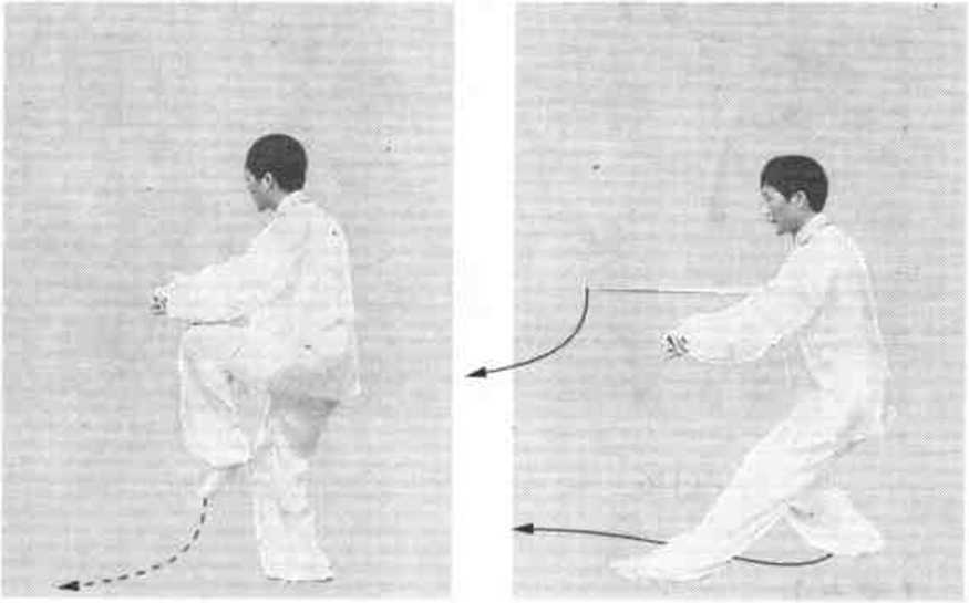 (2) 图119的左脚下落,脚尖要偏向西南,以利右脚上步 方向朝西。