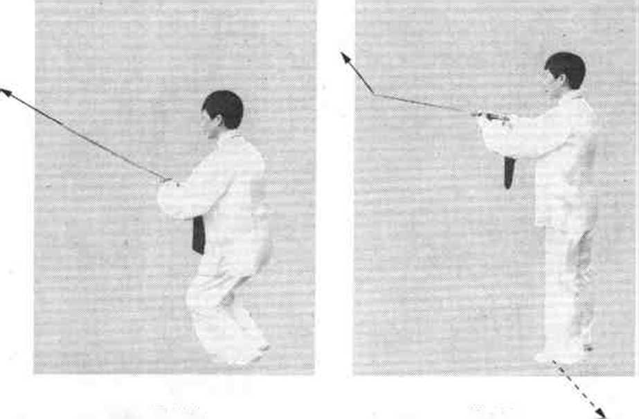 动作一向西北身体稍左转,重心前移至左脚?右脚提起,落于左脚内 侧,脚掌着地;同时,右臂外旋,右手持剑,弧形上提至腹前(平剑),剑尖斜向上;左剑指内收,托于右手背(图144 动作二图 144 m 145i*重心落至两脚中间,两脚自然立起,成并步;同时,两手 将剑先弧形上提后向前刺出,剑尖高不过喉,力达剑尖;方向 西北,目视前方(图145)。图 144 m 145i*说明:该式与第四十一式方向相反,要点相同。