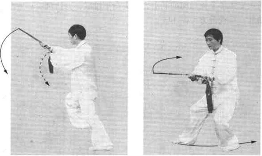 (丨)左右两次带剑,不可直线后抽,要弧形带回,切勿把带 剑练成抽剑。向左带剑时剑尖偏向右;向右带剑时剑尖偏向左。