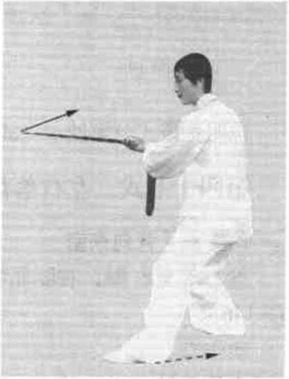 身体右转,右脚提起, 经左脚内侧向右后撤步,先 脚掌着地,后全脚踏实,成 右侧弓步;同时,右臂内旋. 右?心翻向下.持剑先向前 引送,再向右回带,置于右 肋前,手心朝下,剑尖斜向 左,力沿剑刃滑动;左剑指 扶于右腕,手心朝下;面朝 西北,目引带剑(图148)。