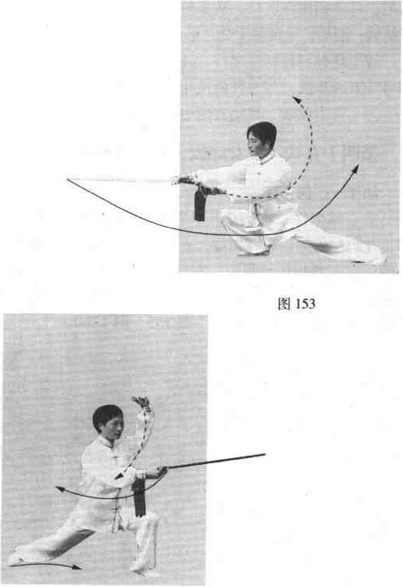 (1 )该式有抹、云、扫三种剑法。图149、图150为抹剑 的过程。图151、图152是云剑过程?练到图151时,剑持成 活把,将剑柄钳在虎口,从觅前顺时针划弧,使剑尖从前额上 方绕转一圈后,呈现图152之形。图153、图154是扫剑姿势。