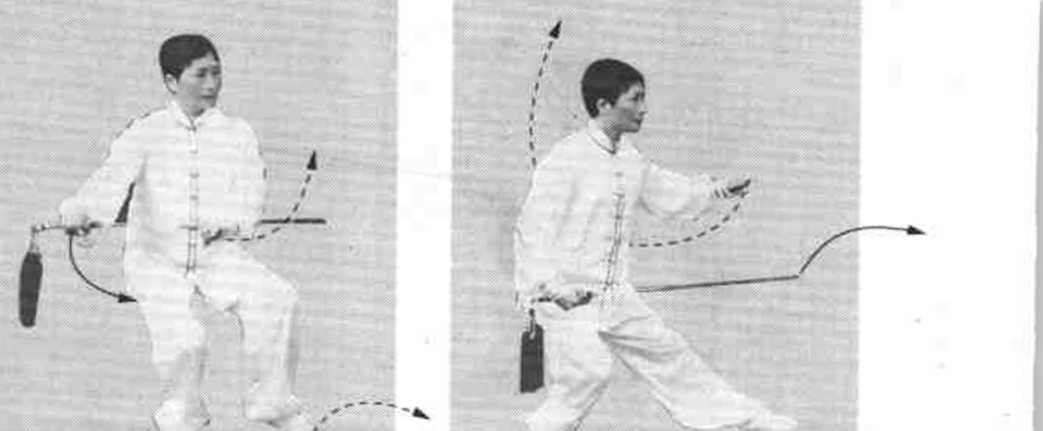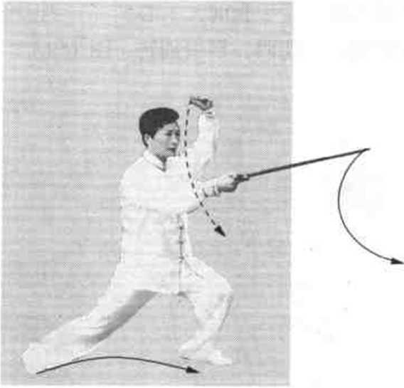 (1) 剑向前刺出,剑尖要与鼻尖一致,如果过于偏右,会 使动作散乱。