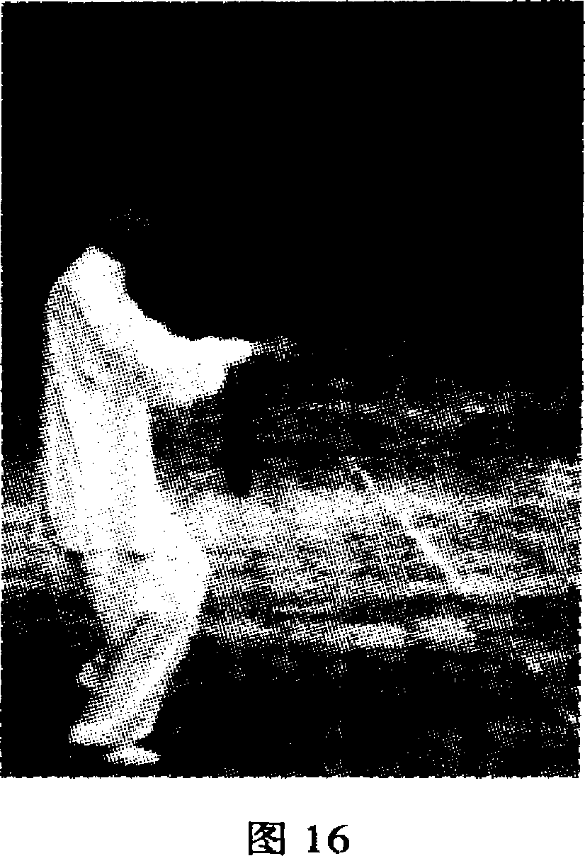 3. 图14腰向右转,重心上 移至右脚成右弓步;同时, 右手持剑向前延伸,右腕 逐渐内旋,手心翻向下,呈 平带剑,向右后带;左剑指 护随右腕内侧,目视前方, 方向朝东(图15)。