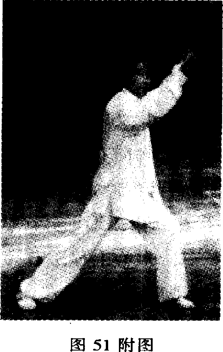 3.向左转腰,重上 移至左脚,成左弓步;同 时,右手持剑,向則上拦 出,与头同髙,剑刃斜向 上,剑尖稍低于剑把;左 剑指弧形上举至左额上 方。目视前方,方向西北 (图51、图51附图)。
