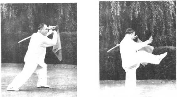 动作2:左腿站起直立,右腿屈膝提起,脚尖自然下垂,脚面 略有绷意,随即向上朝正东踢起。左手仍抱刀,右掌由左向前以 掌心置右脚上方。面向正东,眼平视(图57)。