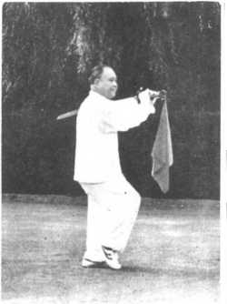 动作3:左臂向里曲做交刀状,右臂由前向左屈肘,并以手接 刀,握刀把。左腿仍为独立势,右腿屈膝上提,脚尖自然下垂。面