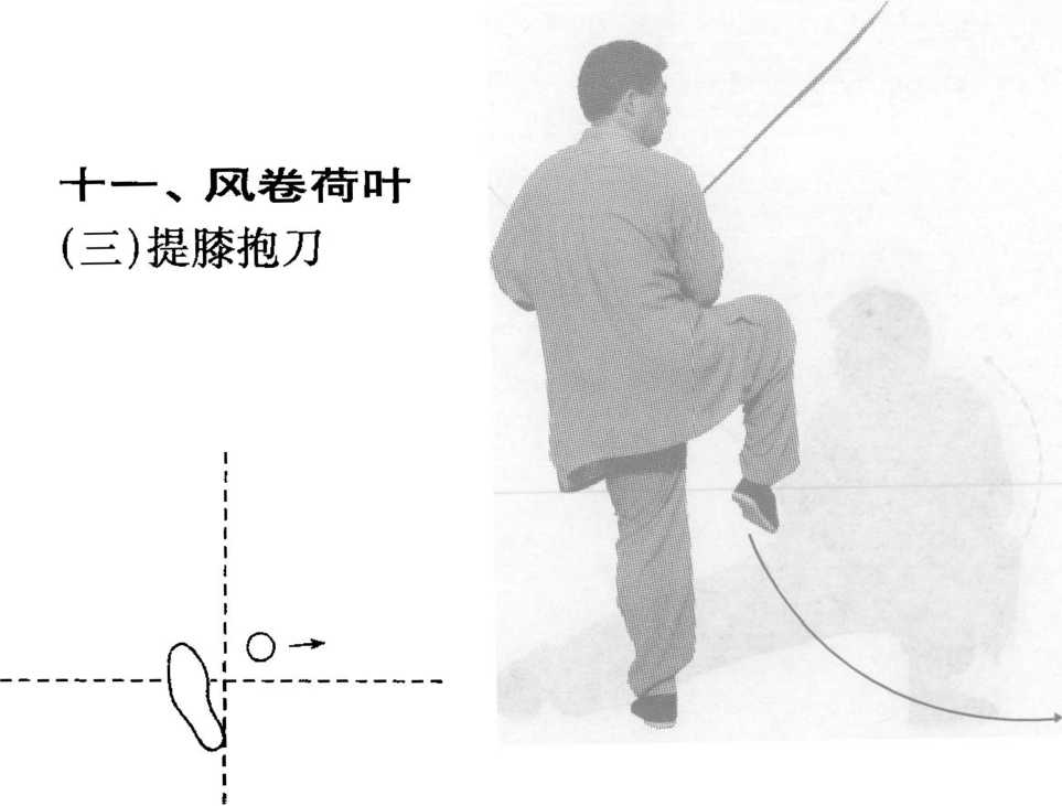 要点:转身与抱刀要协调一致,抱刀要使刀背紧贴于右