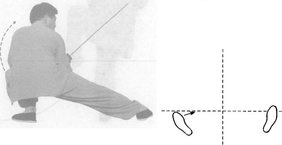 要点:左腿全蹲,右腿铺平,右脚全脚掌着地,臀部里敛。