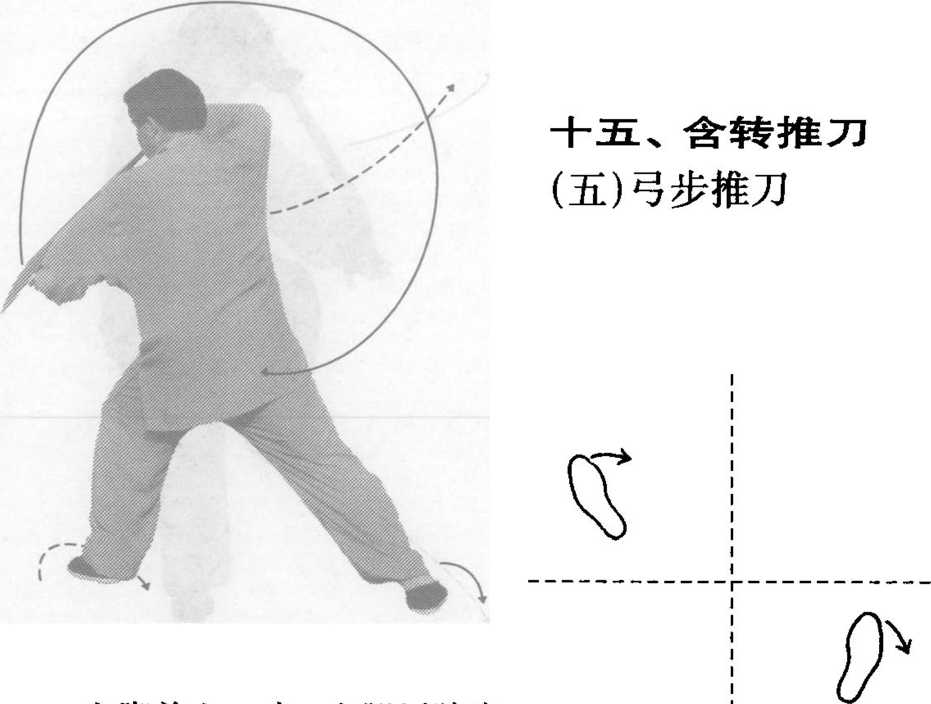 以两足跟为轴,身体右后 转,右腿屈膝半蹲;左腿挺膝蹬 直,成右弓步。同时右手持刀,随
