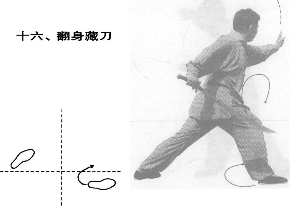 时左臂向左、向下落于体左侧, 掌心向下,掌指向前;右手持刀向上、向左、向下摆刀,使刀背 搭于左前臂上外侧,将刀捧于腹左侧,刀刃向前,刀尖斜向左 下方。目视前方。