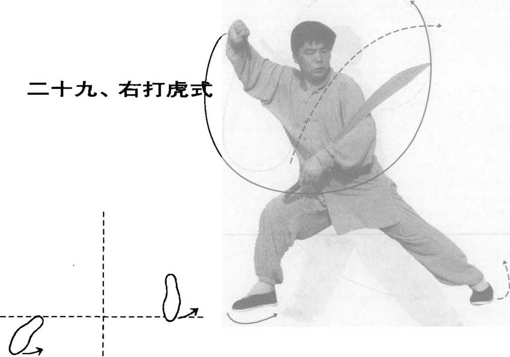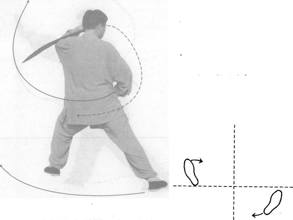 攻防含义:当对方从我身后攻来,我转身用右臂上举架住 对方来拳,并用刀把贯击对方腹部。
