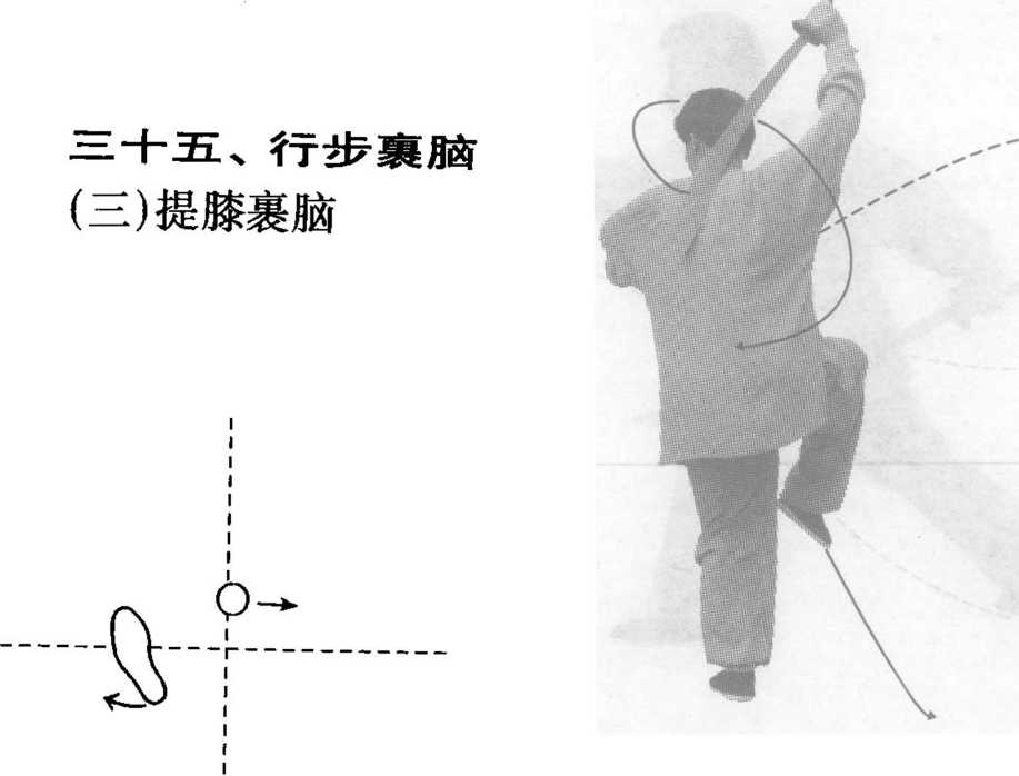 要点:肩要松沉,以腕的转动引导肘关节随动,使刀背贴 近肩背。