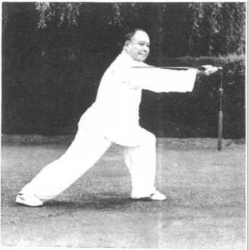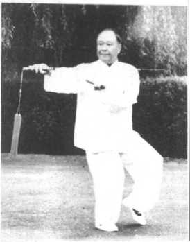 动作1:重心前移,提起左腿呈虚步,左脚跟离地。身向右转, 两臂随腰也向右转(图19)。动作2:左脚向左侧迈出,重心左移,逐渐成左弓步。同时,右 臂先向右转,翻腕翻剑,以仰手平剑外刃向左平带。右手手心朝上, 剑向里扣,左手置右手内侧(图20)。用法:与右拦扫相同,只是左右之分。要点:与右拦扫相同,只是 左脚方向为东北,身体侧 向东南。图20