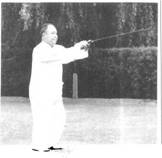 动作:右腿坐稳,提起左腿向正前方迈出半步,右脚随势跟 步向前,两脚向前成马步蹲立,两膝屈。两臂随同腰腿,进步向 前平刺,两手心朝上,成仰手剑,剑尖朝上,左手掌仍托右掌,面 向正东,两眼正前平视(图87)。用法:刺心、刺喉。要点:跟步前刺,身勿呈起伏状。出剑时随同进步以长刺向前刺出. 所谓长刺就是拉长刺剑距离。勿向前搁或摆。图87