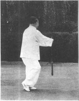 动作1:重心左移,身向左 转,右脚呈虚步,脚跟离地。两 臂随同腰腿向左转,持剑立于 左侧(图91)。