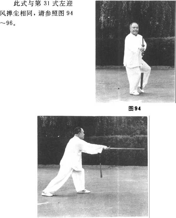 以手腕将剑收回,立于右侧, 左手剑指仍在右手腕内侧。 面向右侧眼向前看(图 93)。用法与要点,请看上式。以手腕将剑收回,立于右侧, 左手剑指仍在右手腕内侧。 面向右侧眼向前看(图 93)。用法与要点,请看上式。图92图92图93图93