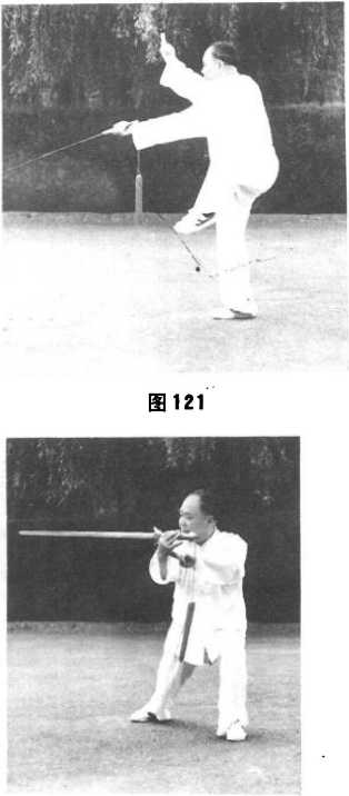 动作1:左臂翻腕 转臂,手心侧向上(图 121)0动作2:左腿向左 侧迈出,成左斜弓步。身 向左转,剑随腰腿向左 后将剑抽回。剑柄在左, 手心向里,剑尖在右,剑 平置于肩前,回头看正 西。左手置右手腕内侧 (图 122)。用法:提其手腕,以观其 变,待机而动。要点:此式亦称回头望 月,回头看的剑式只此 一式。剑宜平宜正,勿 遮眼,两臂宜撑圆。上 身勿直挺,略呈斜状。