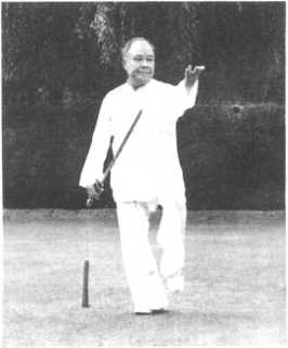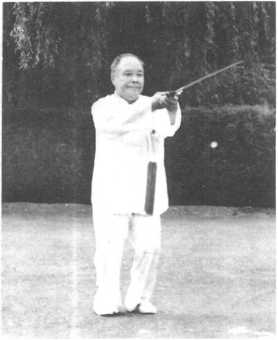 动作1:提起左腿,左手变掌,掌心朝上,右手持剑翻腕略向 后收剑(图126)。动作2:左腿向前迈步,右腿紧跟上步,两脚直前成马步。右 臂随同腰腿由后向前往上,以正剑用双手将剑刺出。左手以掌托 右手。面朝东南,.眼观剑尖前方(图127)。用法:刺喉。要点:重心要稳,身勿呈起伏状,上步、刺剑两者要协调一致。