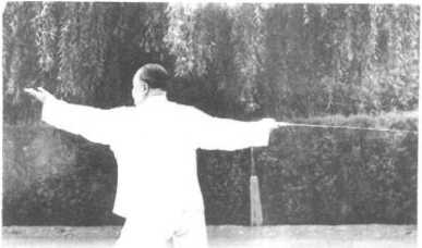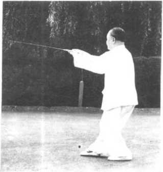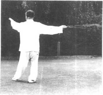 ’当右腿上步,两臂相 合时,注意剑身宜平,并 随腰腿之转动,带剑平合。