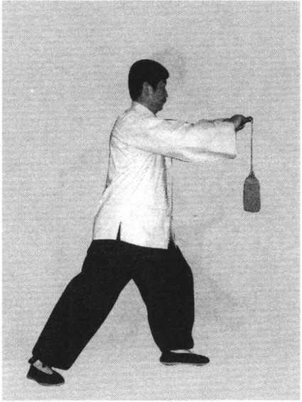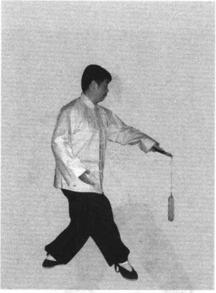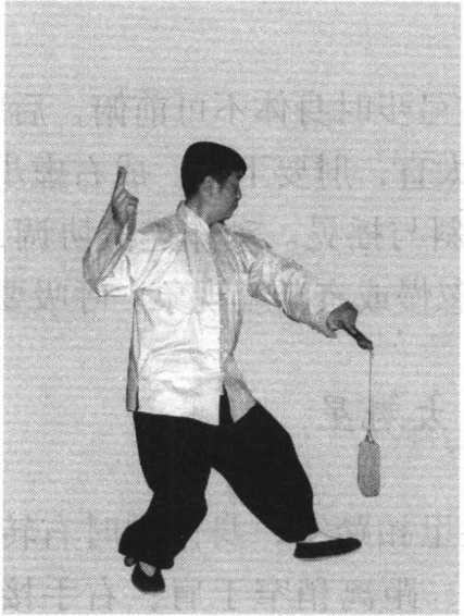 右转由上向下撩剑;左手在右手接剑后变剑指附在右 腕旁,手心向下;眼神随剑的动作而转动。(图1-15、 图 1-16)