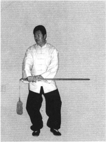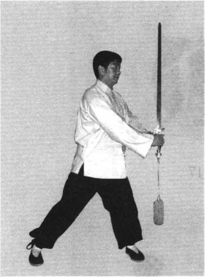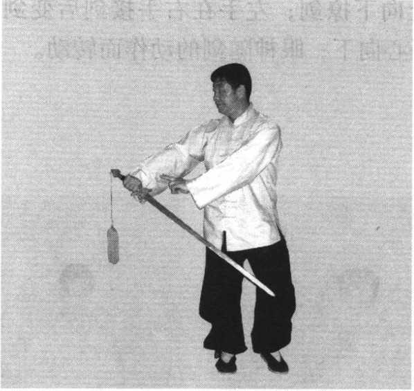 前,左手握剑,剑身贴在左前臂下,剑尖指向左后(西