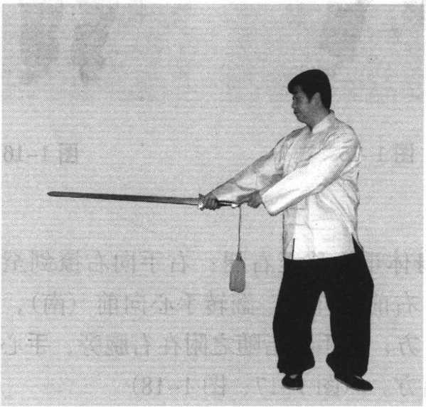2. 身体重心移至右腿;右手向右撩剑至身体右侧 将尽时,右前臂外旋,翻转手心向前(南),剑尖指向 右(西)方;左手剑指随之附在右腕旁,手心向下;眼 视剑尖前方。(图1-17.图1-18)