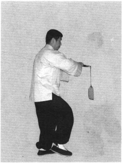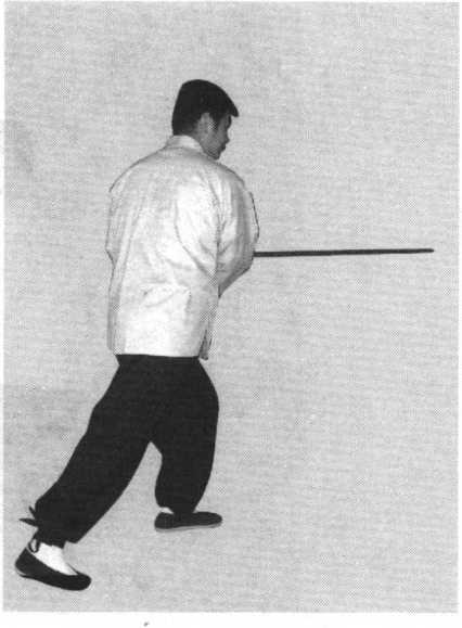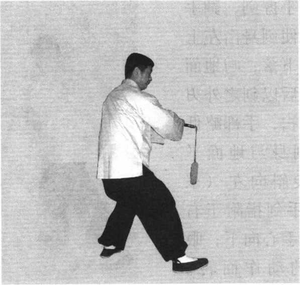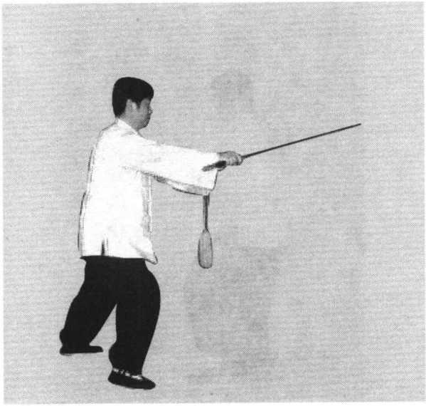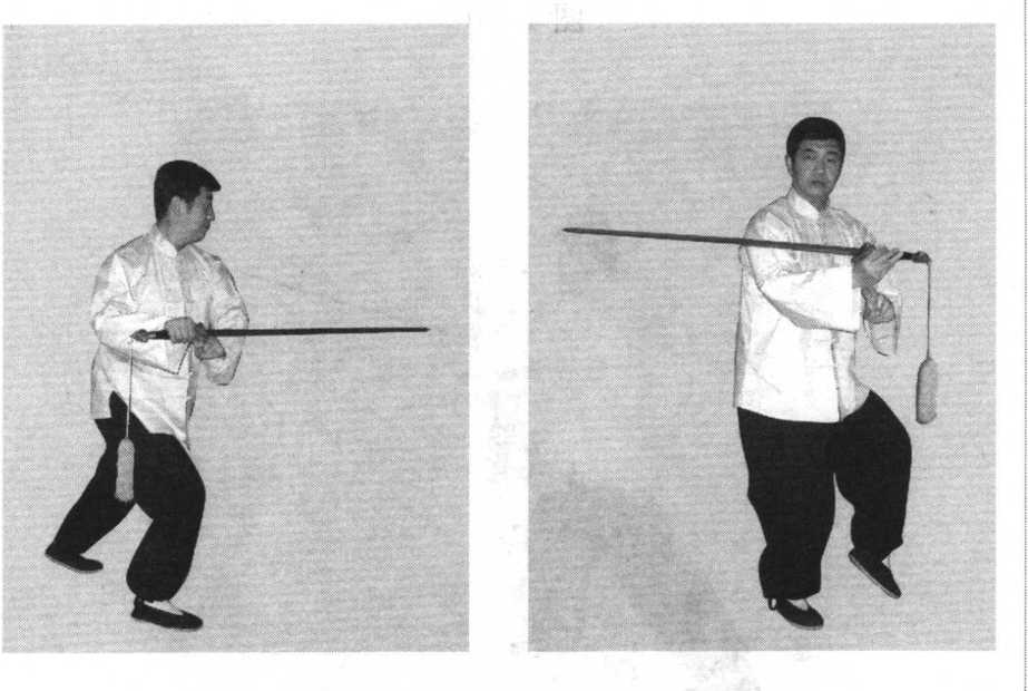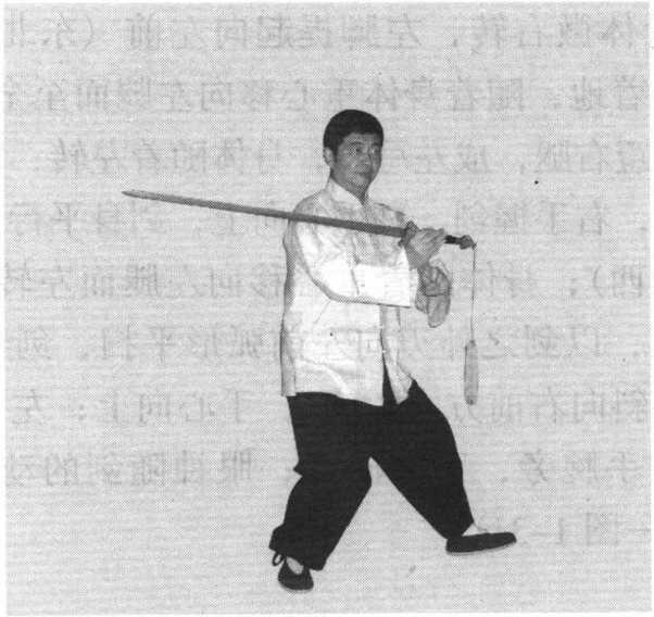 图 1-24图 1-24第—?章杨 式 大 极 ,剑第—?章杨 式 大 极 ,剑内旋,右手握剑,翻手 心向下,使剑身由左上 往后、向下落,与地面 平行,然后以剑之外刃 向右后平扫,手部略低 于肩,剑身与地面平, 行,剑尖斜向左(东 北);左手剑指附于右 手腕旁,手心向下;眼 神随剑的动作而转。 (图 1-24—图 1-27)