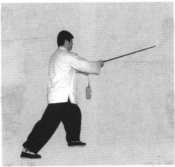 2. 图 1-28 图 1-29图 1-28 图 1-29第.业 早杨式太极剑第.业 早杨式太极剑身体微右转,左脚提起向左前(东北)迈出, 先以脚跟着地,随着身体重心移向左腿而至全脚踏实, 弓左腿,蹬右腿,成左弓步,身体随着左转;同时,右 前臂外旋,右手握剑,翻手心向上,剑身平行地面,剑 尖向后(西);身体随着重心移向左腿而左转;同时, 右手握剑,以剑之外刃向左前弧形平扫,剑身略低于 胸,剑尖斜向右前方(东南),手心向上;左手剑指随 之附于右手腕旁,手心向下;眼神随剑的动作而转。 (图 1-28—图 1-31)