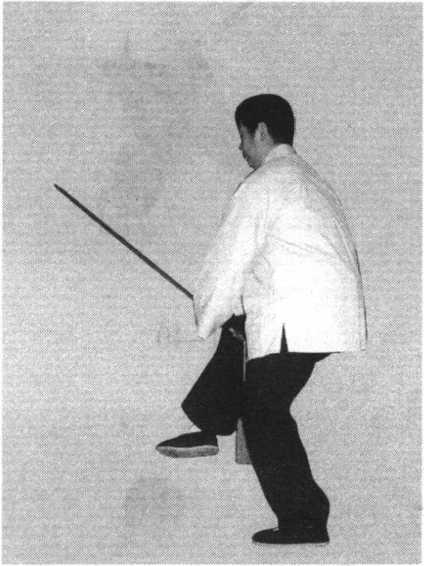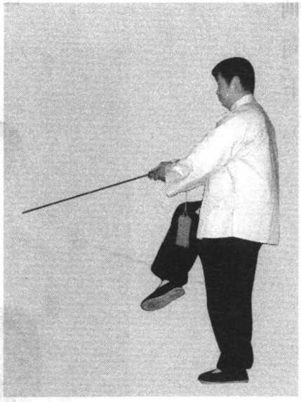 1.左脚尖外撇,左腿直立,右脚向前屈膝提起至 大腿与地面平,脚尖自然下垂;两手握剑回收至腹前,