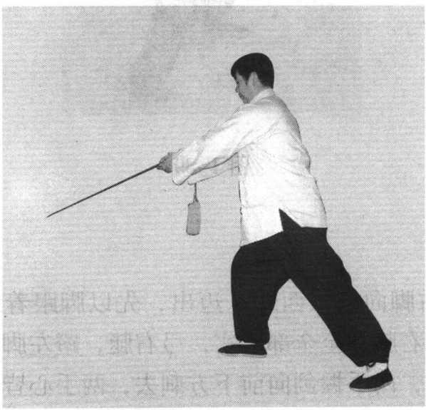 3. 右脚向前(西北)迈出,先以脚跟着地,随着 重心移向右腿而至全部踏实,弓右腿,蹬左脚,成右弓 步;同时,两手握剑向前下方刺去,两手心皆向上;眼 视前下方。(图1-40、图1-41)