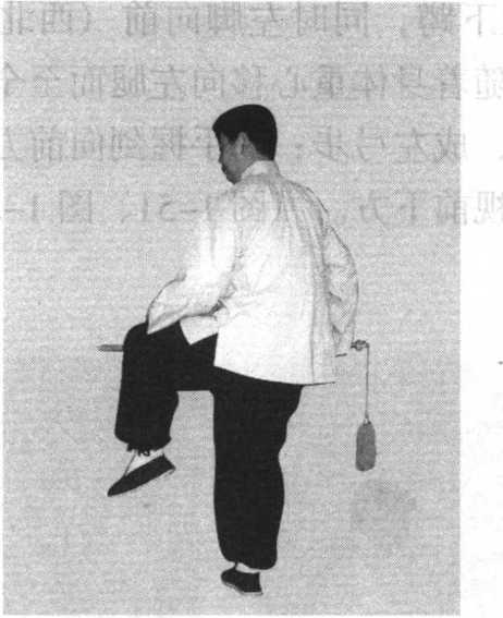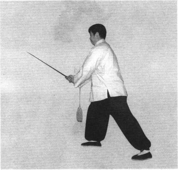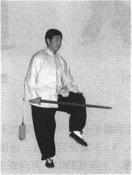 4. 身体重心不变,右腿直立,左脚向前提起至左 大腿与地面平,脚尖自然下垂;同时,右手握剑下落至 右胯旁,剑尖指向左后(西北)方,手心向里;左手下 落至左膝上;眼视前方。(图1-50.图1-50附图)