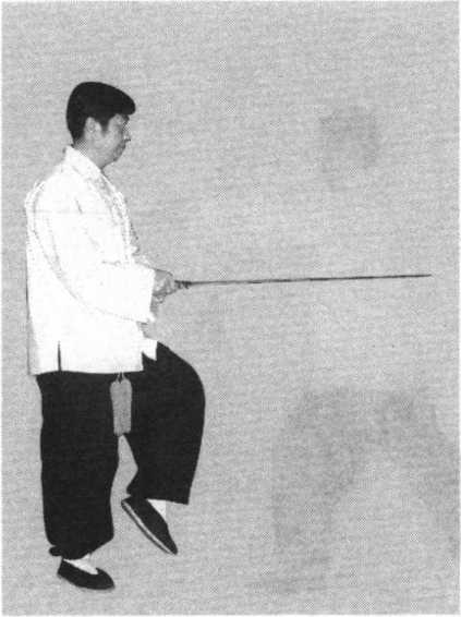 4. 身体重心不变;右手握剑,往回抽至腹前;左 手剑指随之附于右手腕旁,手心向下;同时,右脚向前 提起,脚尖自然下垂;眼视前方。(图1-70、图1-71)