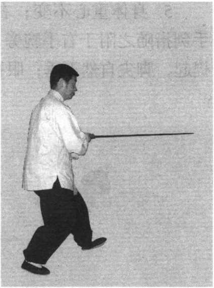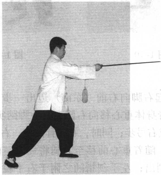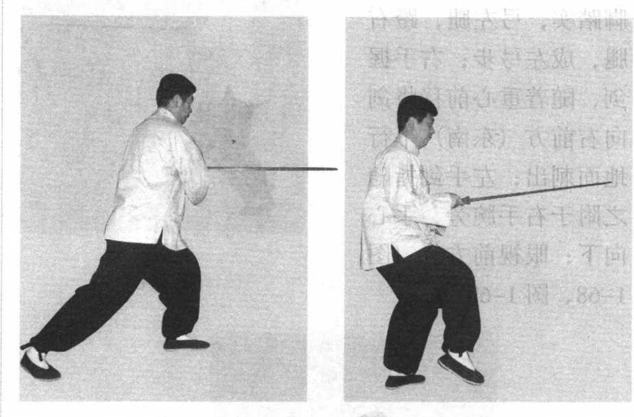【要点】转身向前迈步时上体要正直,身体不可摇 晃歪斜或前俯后仰,尾闾要中正,不可凸臀。成弓步时 后脚跟不可抬起。剑向前刺时要与地面平行。剑身不可 与地面有夹角。刺剑要与弓步同时完成。