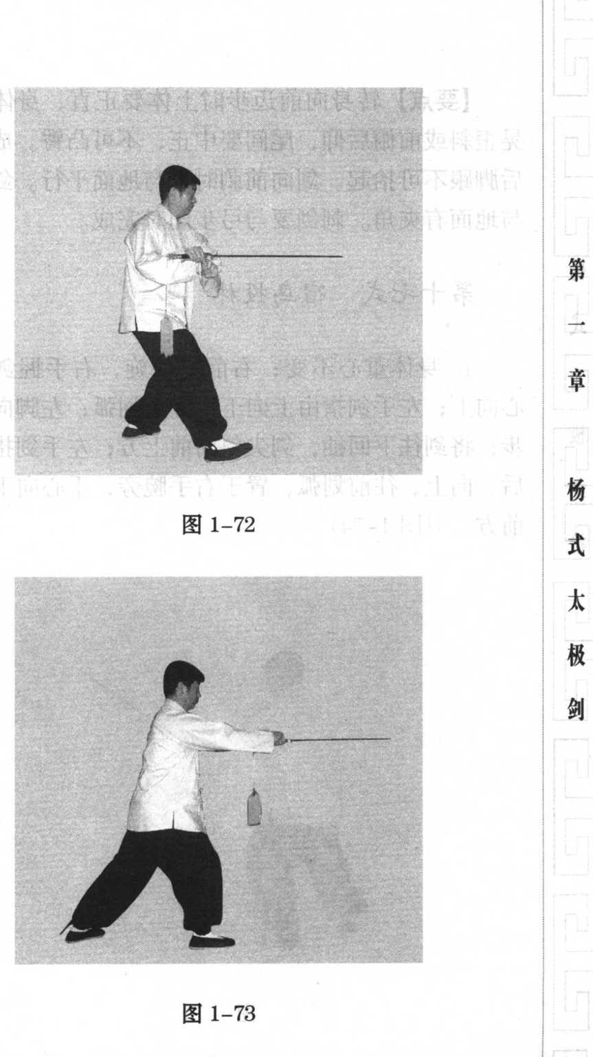 5. 提起右脚向右前(东南)迈出一步,先以脚跟 着地,随着身体重心移向右腿而至全脚踏实,弓右腿, 蹬左腿,成右弓步;同时,右前臂内旋,右手握剑,翻 手心向下,随着重心前移至右腿将剑向左前方(东北) 平行地面刺出;左手剑指随之附于右手腕旁,手心向 下;眼视前方。(图1-72、图1-73)
