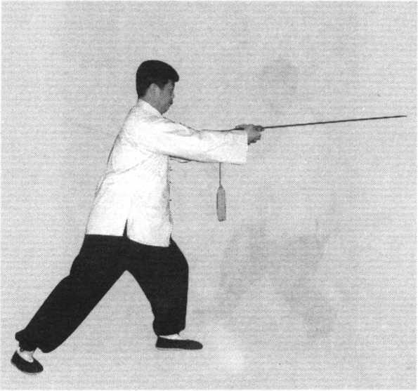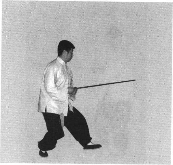 2. 图 1-109图 1-109左脚向前迈步,先以脚跟着地,随着身体重心 移向左腿而至全脚踏实,随即右脚提起向前与左脚并 步,两腿直立;同时,两手抱剑向前(东)方平刺,剑 身与地面平,两手心皆向上;眼视前方。(图1-110. 图 1-111)