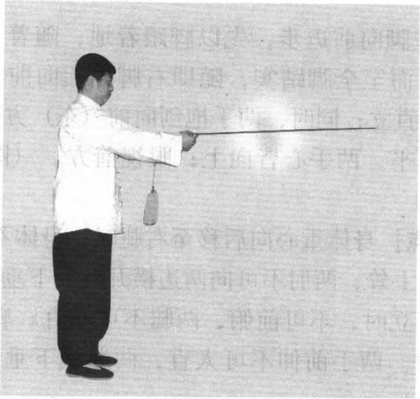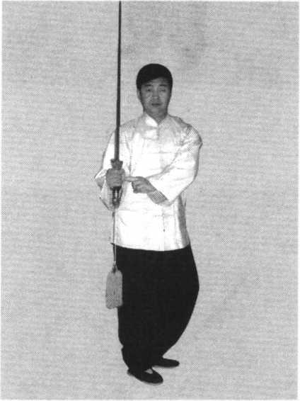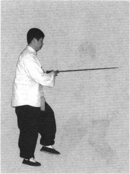 1. 身体重心向后移至右腿,左腿向上提起至大腿 与地面平,脚尖自然下垂;同时,两手握剑回抽至腹 前,剑身与地面平,两手心皆向上;眼视前方。(图 1一108、图 1-109)
