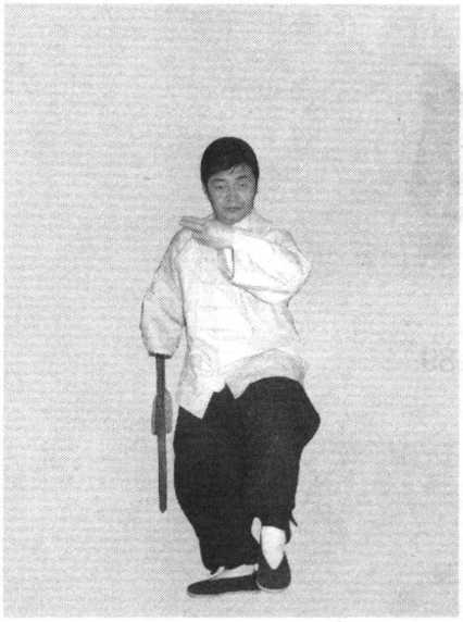 【要点】左脚迈步时,右腿站立要稳,不可歪斜摇 晃。左脚迈步方向要正确,不可过大或过小。成弓步时 身体不可前倾,后脚跟不可抬起。左肘要下垂,不可上 翘。肩要放松,不可向上耸起。