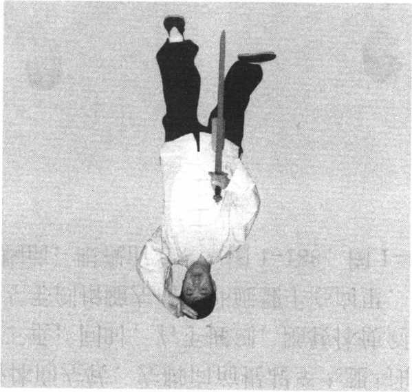 3 .左脚向前迈出一步,先以脚跟着地,随着身体重 心移向左腿而至全脚踏实,弓左腿,蹬右脚,成左弓 步;同时,右手握剑向前(南)下方刺去,手心向上; 左手剑指随左前臂内旋翻手心向外,由下向上环形置于 头部前上方;眼视下前方。(图1-189、图1-189附图)