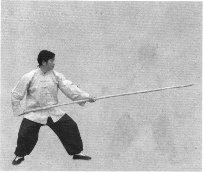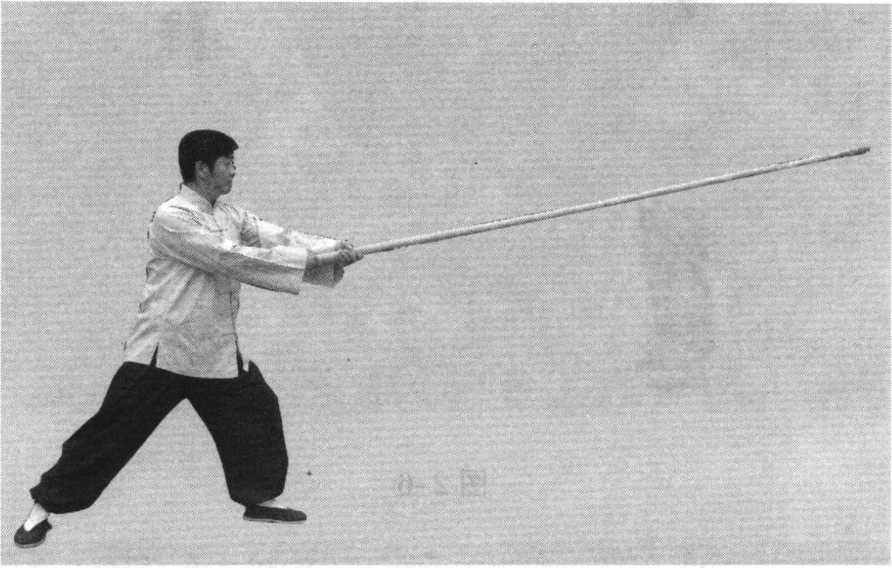 【要点】重心向前移至左腿时,身体不可前俯,右 脚跟不可抬起,当右手接近左手时要用寸劲,两眼仍视 枪头前方。
